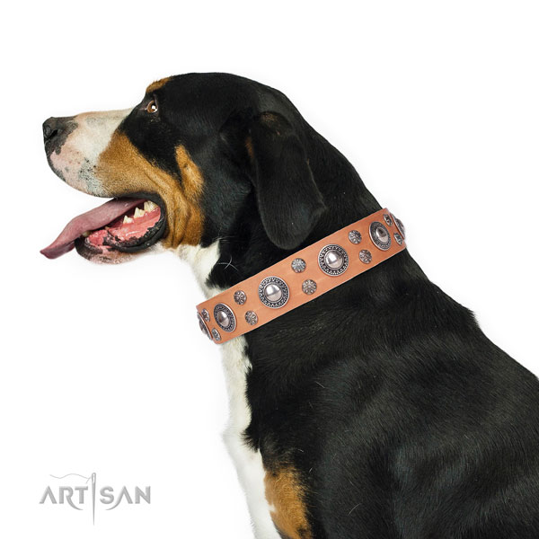 Chrome plated traditional buckle will hold out even the hardest dog power. Stylish adornments are chrome plated and have luxury look. Give emphasis to your Swiss Mountain Dog's style, purchase this Artisan gorgeous natural leather collar!